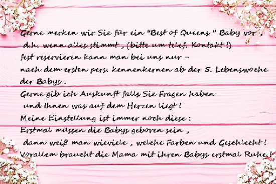 Wir betreiben unsere Zucht ordnungsgemäß und angemeldet , deshalb wird auch nicht "gehandelt " , es sind Lebewesen u. keine Ware und wir müssen auch unsere Tierhaltung teuer bezahlen ..Anfragen ohne Namen ect. beantworte ich nicht ...... Ich bitte um Verständnis !